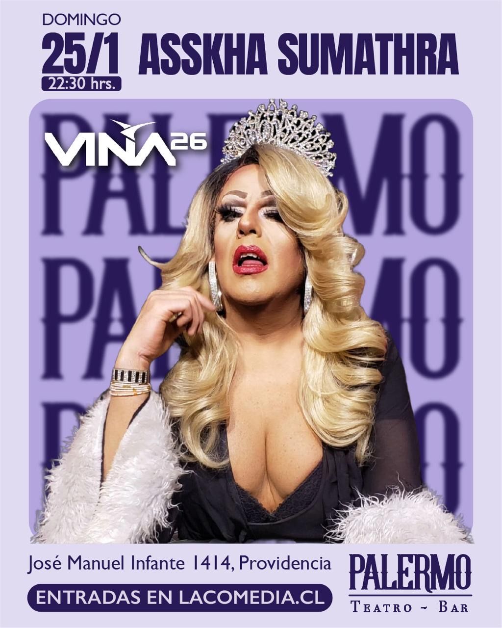 ASSKHA SUMATHRA , la reina del café Concert vuelve a Palermo luego de su exitoso paso por el programa Coliseo de Mega , con un hilarante show que promete hacernos reír de principio a fin . Acompaña a Asskha en su camino al festival de Viña del Mar.